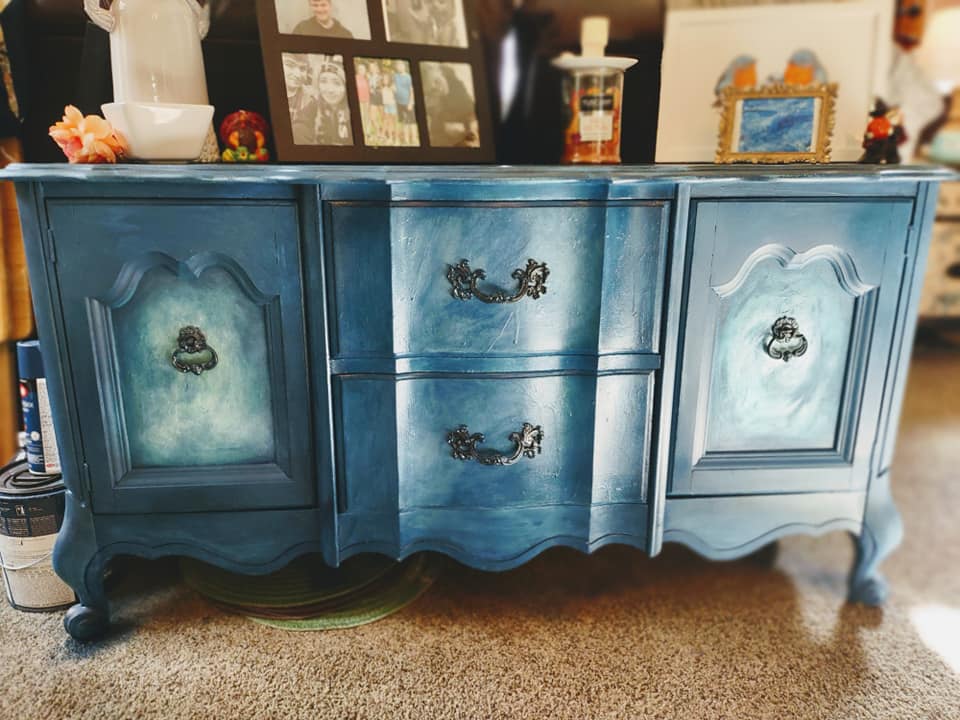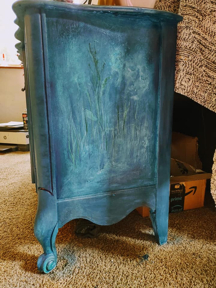 So, this buffet represents this dream. I painted to show water, and movement. Different shades of blue. Sparkles even, to show light. The sides, the bottom of the ocean. Which also represents a poem I wrote about depression and rising above it, called ‘kick’. I took my time until I was happy with it. I wanted to celebrate, movement. Continuing on through sadness. Celebrating, that she still swims.
