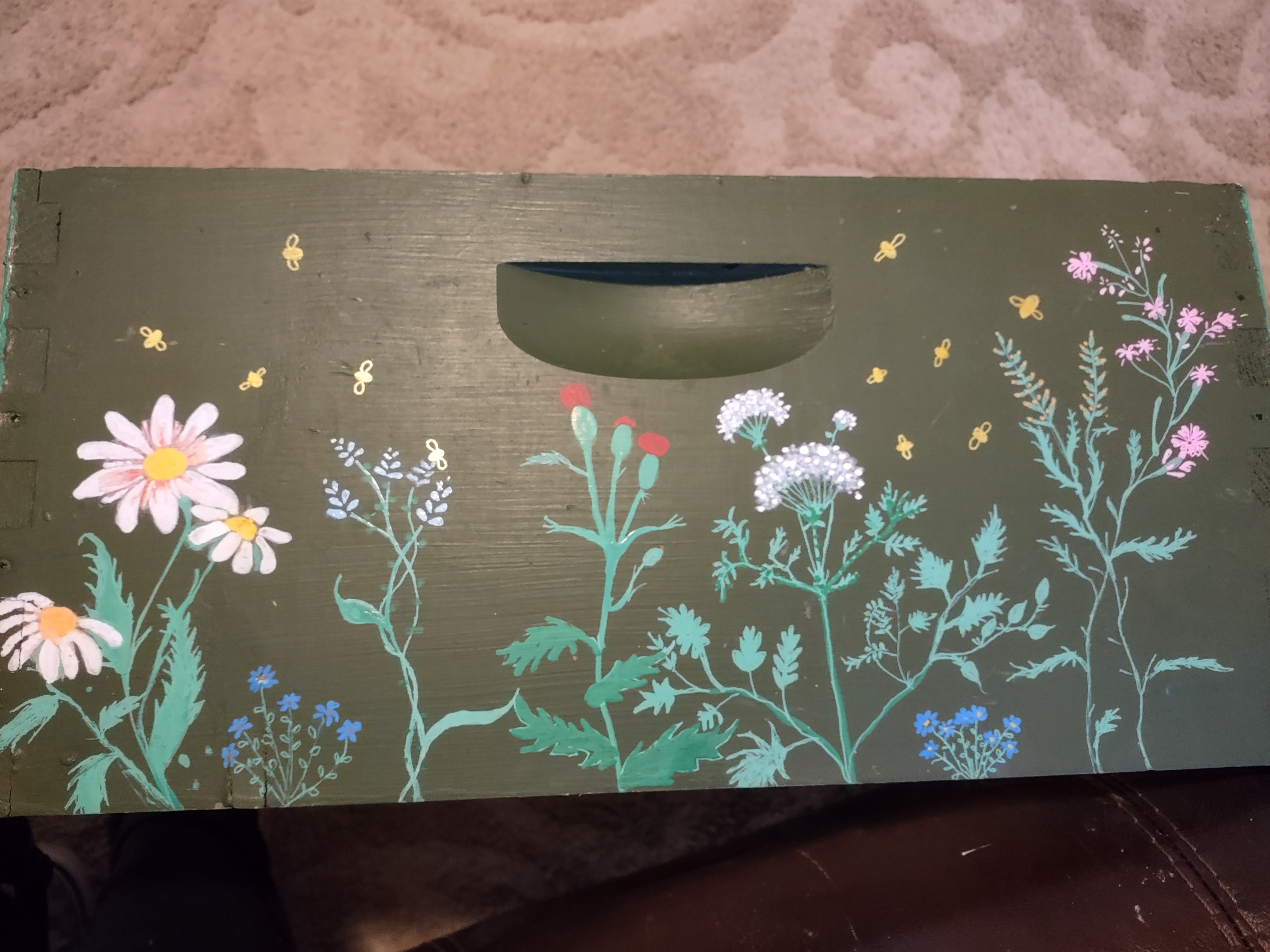 Spending some time painting on a bee box for a family member who wants to start Bee hiving. Not sure what the official name of it is called. Each side of it has a different picture.
